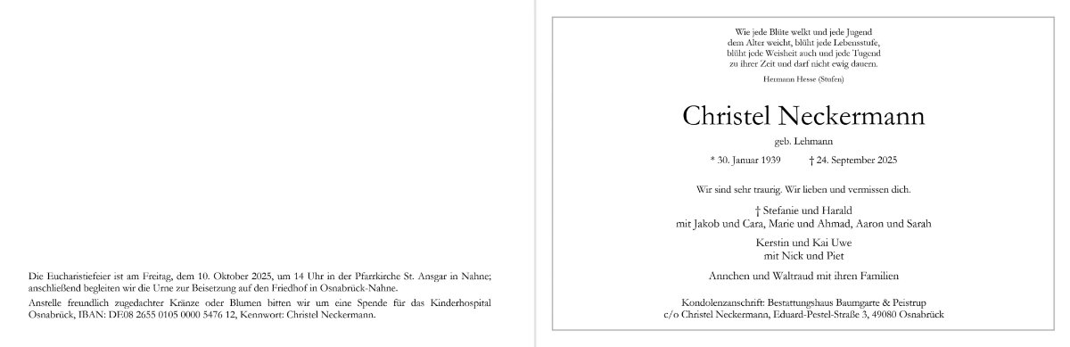 wir wünschen Ihnen von Herzen viel Kraft, dass Sie Menschen um sich haben, die Ihnen in dieser schweren Zeit beistehen und Halt geben. Zusätzlich können Sie auf dieser Gedenkseite Erinnerungen teilen und so das Andenken gemeinsam wachhalten.