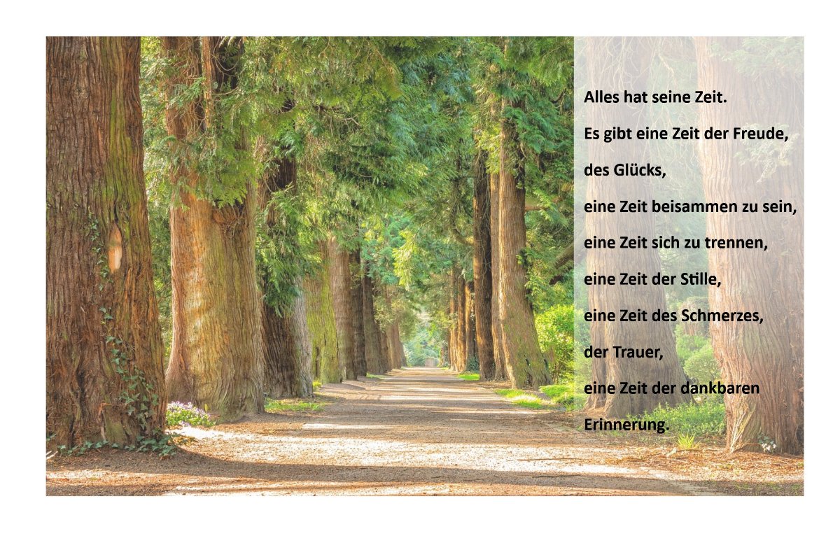 wir wünschen Ihnen von Herzen viel Kraft, dass Sie Menschen um sich haben, die Ihnen in dieser schweren Zeit beistehen und Halt geben. Zusätzlich können Sie auf dieser Gedenkseite Erinnerungen teilen und so das Andenken gemeinsam wachhalten.