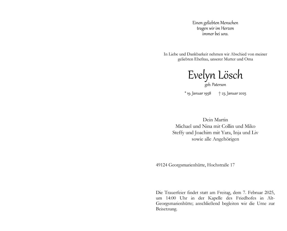 wir wünschen Ihnen für die kommende Zeit viel Kraft und dass es Ihnen gelingt, dankbar auf die positiven Erinnerungen zurückzublicken. Diese Gedenkseite möge Ihnen dabei helfen, Ihre Trauer zu teilen und das Andenken gemeinsam wachzuhalten.