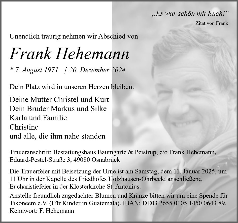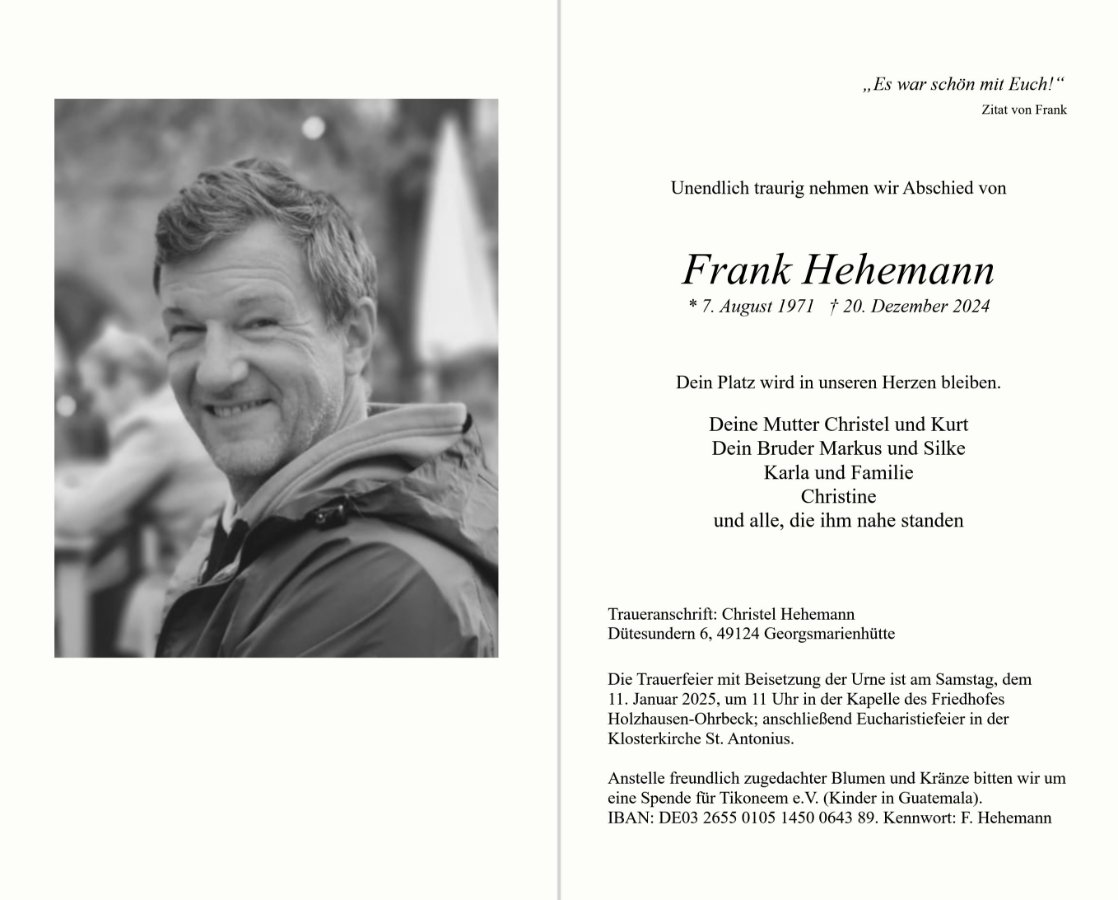 wir wünschen Ihnen von Herzen viel Kraft, dass Sie Menschen um sich haben, die Ihnen in dieser schweren Zeit beistehen und Halt geben. Zusätzlich können Sie auf dieser Gedenkseite Erinnerungen teilen und so das Andenken gemeinsam wachhalten.