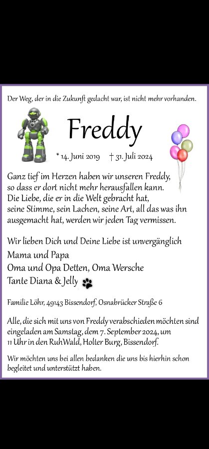 Wir denken an Sie und an Freddy und wünschen Ihnen die Kraft, die Sie brauchen, um in dieser schweren Zeit zu bestehen.