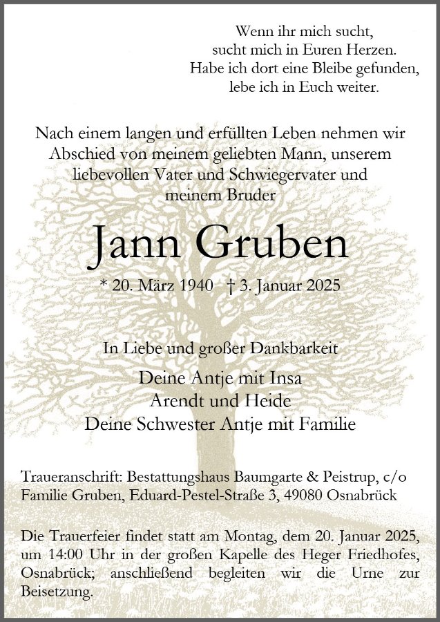 in diesen Tagen fühlen wir mit Ihnen und wünschen Ihnen von Herzen, dass Sie aus den glücklichen Erinnerungen Kraft schöpfen, um positiv in die Zukunft zu gehen. Diese Gedenkseite möge Ihnen dabei helfen, Ihre Trauer zu teilen und das Andenken gemeinsam wachzuhalten.