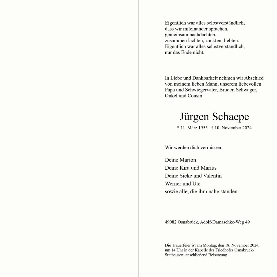 in dieser Zeit des Schmerzes wünschen wir Ihnen Kraft, den Verlust im Kreise Ihrer Liebsten zu verarbeiten. Als Zeichen unserer Anteilnahme und des Gedenkens entzünden wir dieses erste Licht. Möge diese Gedenkseite Ihnen helfen, Erinnerungen zu teilen und so das Andenken gemeinsam wachzuhalten.