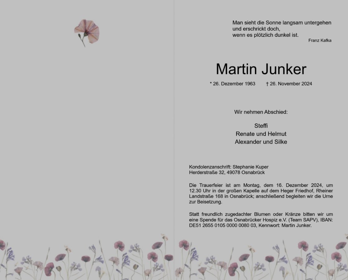 wir wünschen Ihnen für die kommende Zeit viel Kraft und dass es Ihnen gelingt, dankbar auf die positiven Erinnerungen zurückzublicken. Diese Gedenkseite möge Ihnen dabei helfen, Ihre Trauer zu teilen und das Andenken gemeinsam wachzuhalten.