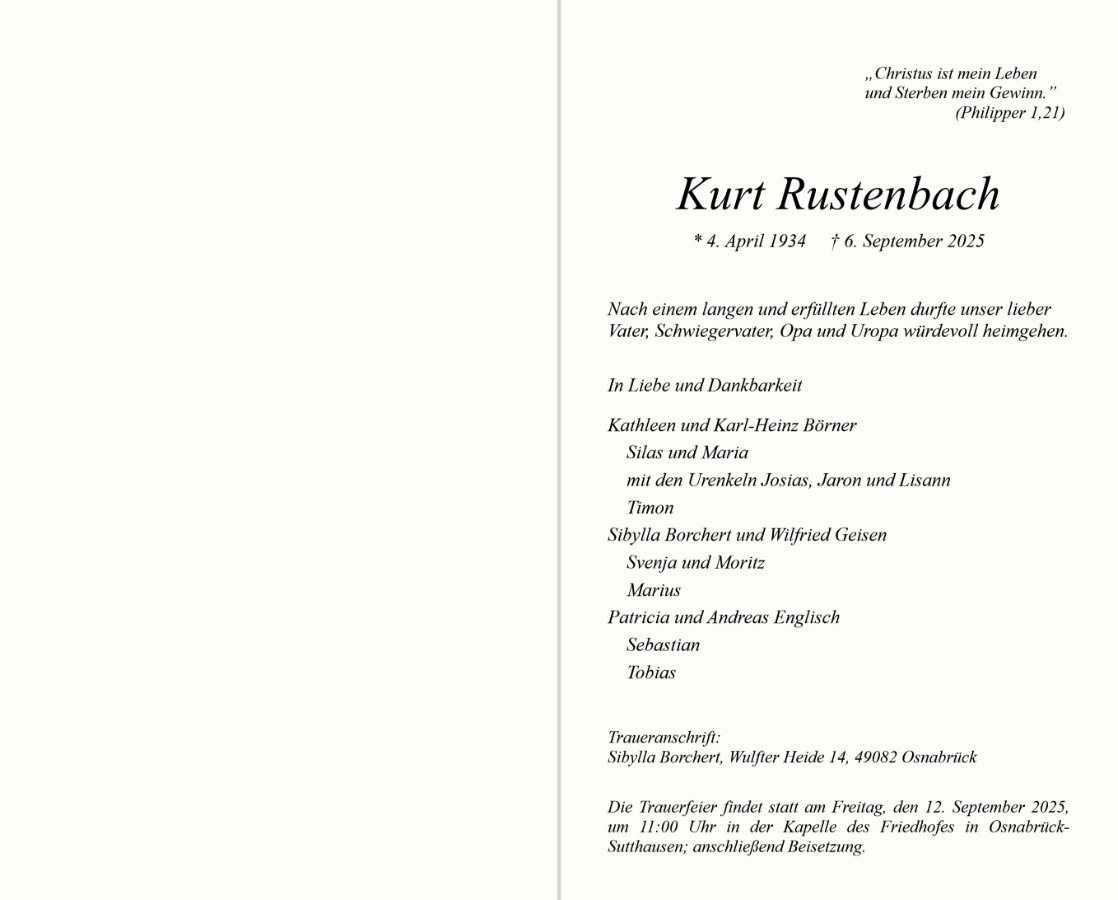wir wünschen Ihnen für die kommende Zeit viel Kraft und dass es Ihnen gelingt, dankbar auf die positiven Erinnerungen zurückzublicken. Diese Gedenkseite möge Ihnen dabei helfen, Ihre Trauer zu teilen und das Andenken gemeinsam wachzuhalten.