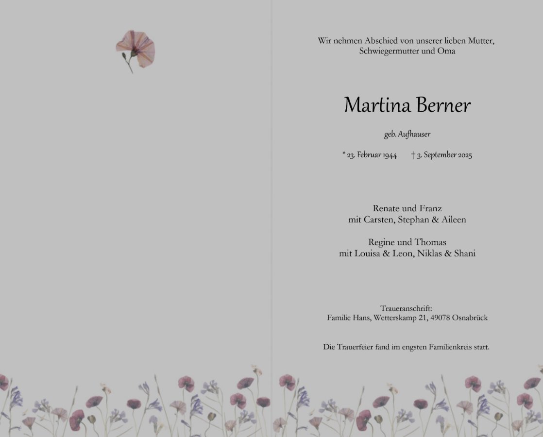 wir wünschen Ihnen von Herzen viel Kraft, dass Sie Menschen um sich haben, die Ihnen in dieser schweren Zeit beistehen und Halt geben. Zusätzlich können Sie auf dieser Gedenkseite Erinnerungen teilen und so das Andenken gemeinsam wachhalten.