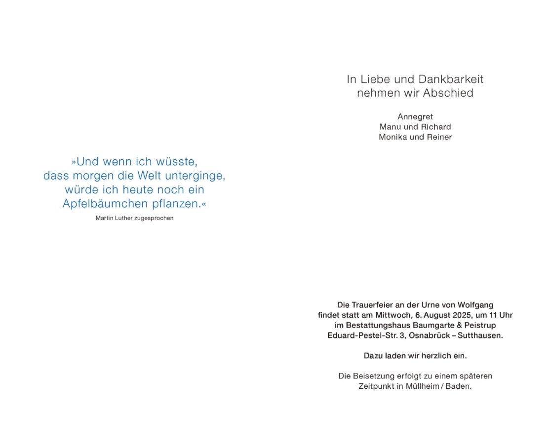 in diesen Tagen fühlen wir mit Ihnen und wünschen Ihnen von Herzen, dass Sie aus den glücklichen Erinnerungen Kraft schöpfen, um positiv in die Zukunft zu gehen. Diese Gedenkseite möge Ihnen dabei helfen, Ihre Trauer zu teilen und das Andenken gemeinsam wachzuhalten.
